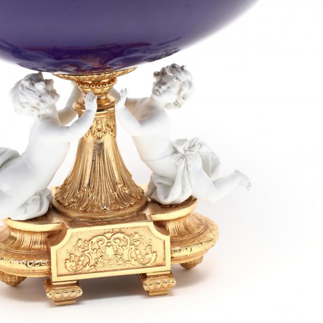 20th century, two bisque porcelain puttis rest upon a gilt metal base supporting a deep oval bowl of cobalt glaze with gilt foliate flourishes, a gilt metal rim to bowl incorporates a twisted and beaded edge.
