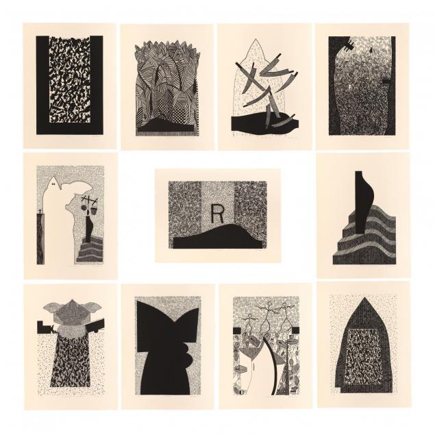 Eleven linocuts on cream wove paper, 1995, each pencil signed, dated, titled, and marked as bon à tirer (BAT) lower margin, titles to include "Rwanda," "Having Strayed too Far From Home," "There is No Shame," "Tightrope Walkers," "Weeping Woman," "Weeping Man," "Silo," "Before the Order is Given," "Dug by Speeches, Dug by Wallets, Dug by Intellect," "Council of Convenience," and "Voiceless," unframed.