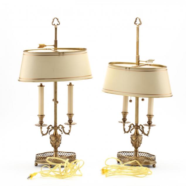 Late 20th century, brass, two light form, adjustable metal shade, reticulated base.