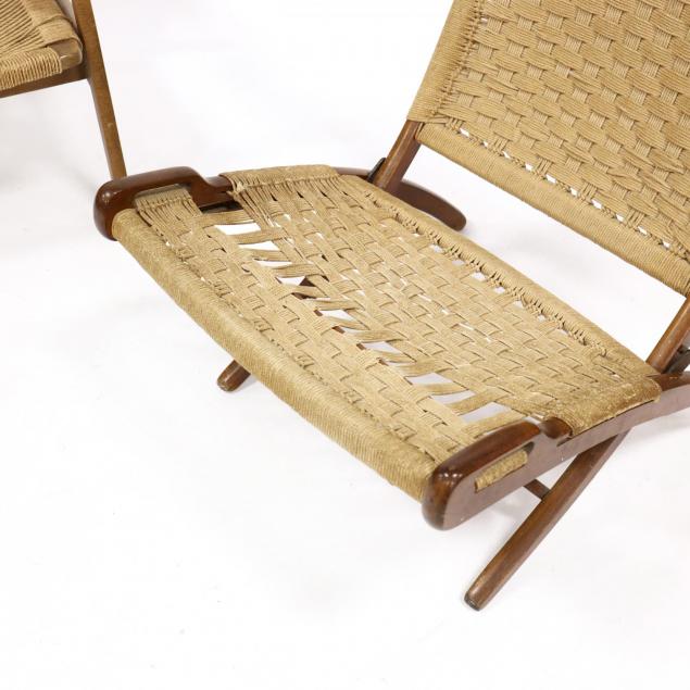 Mid 20th century, teak, labeled "Yugoslavia", including an arm chair and a folding side chair, with woven grass seats.
