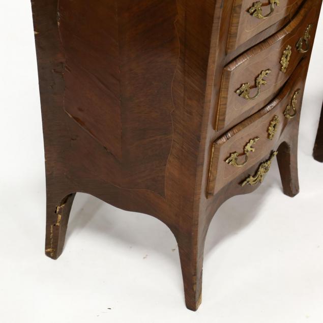 From the Collection of Tony & Linda Bakker, Charleston, SC Veneer loss to one chest at front left foot; some veneer shrinking and minor chipping throughout both; missing one lock; repair to back left foot of one; old repair to edge of one marble.