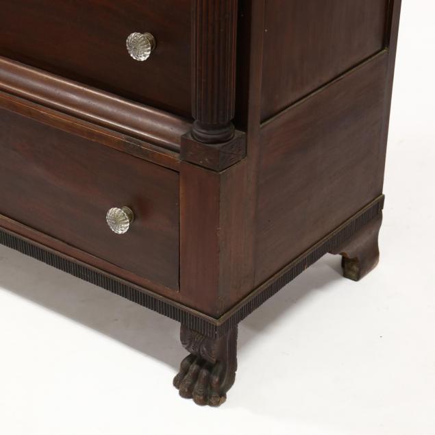Early 20th century, mahogany, poplar secondary, one part form, projected cornice with applied reeded frieze, two over six graduated drawers with original glass pulls flanked by fully turned and fluted columns, reeded skirt, acanthus and carved paw feet.