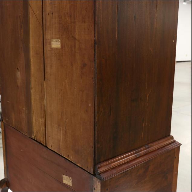Collection of Charlie Marshall, Pittsboro, NC Restoration; later finials; lower central drawer reworked; three drawers with crack and repair to upper lip; shrinkage crack to lower case sides.