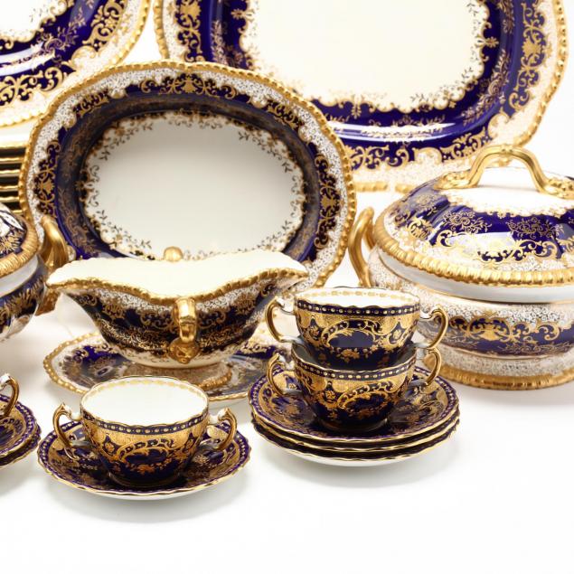 Circa 1900, (56) pieces including: Coalport Pattern Z976 featuring a cobalt band encrusted with raised gold arabesques and scrolls surrounded by a shaped beaded border featuring twelve dinner plates (10.5 in.); ten luncheon plates (9 in.); two covered round vegetable servers (6.5 x 9 in.) (one with interior discoloration); a platter (12.5 in.); three open serving dishes (one with hairline around the bottom); a gravy boat and under tray. Closely associated in design are two Coalport covered round servers Pattern Z499 (both with hairlines); and Mintons twelve consommé cups with twelve saucers.