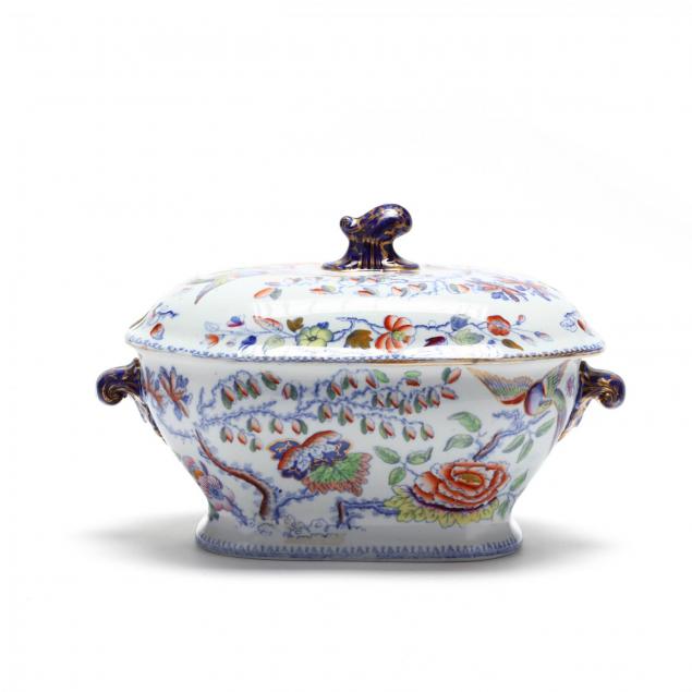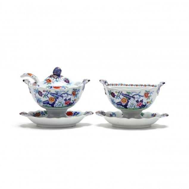 (13 pc.) circa 1820-1850; to include (6) Davenport chinoiserie decorated "Flying Bird" plates, marked "Stone China;" (3) Davenport chinoiserie decorated "Flying Bird" scalloped serving dishes, marked "Stone China;" (1) Mason's chinoiserie decorated "Flying Bird" serving platter, marked "Mason's Patented Ironstone China;" Mason's chinoiserie decorated "Long Tailed Pheasant" platter, marked "Mason's Patented Ironstone China;" and (2) Japan sauce boats both with attached under plates, one with spoon, chinoiserie decorated "Opaque," marked "Japan Opaque China."