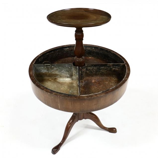 20th century, mahogany, top with molded edge, baluster turned standard, lower rotating, fernière with four divided galvanized metal inserts, raised on cabriole legs with pad feet.