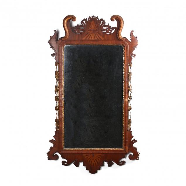Circa 1800, mahogany veneers, pine secondary, crest and base with central light and dark wood stylized fan inlay, pierced and gilt carvings throughout, later mirror with gilt liner.