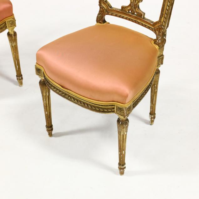 From the Collection of Tony & Linda Bakker, Charleston, SC Later upholstered seats with wear and one tear; gilt and gesso loss throughout on each chair; one finial tip missing.