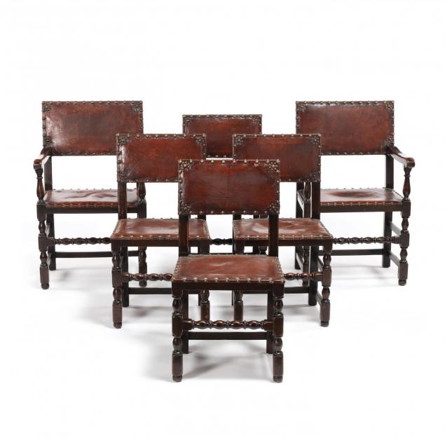 Late 19th century, two arm and six side chairs, old brownish red leather back and seat, with patinated brass nailhead trim, turned arm supports, ring turned front stretchers.