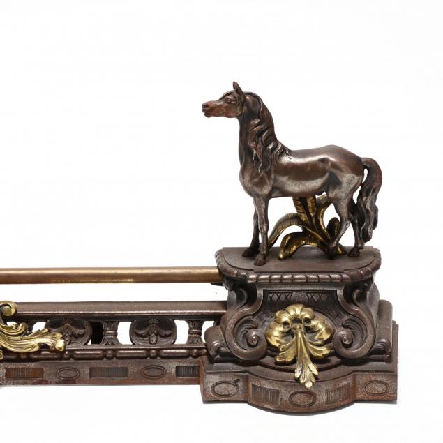 Late 19th century, cast iron and brass, adjustable ends surmounted by full bodied silver plate horses, applied brass scroll work.