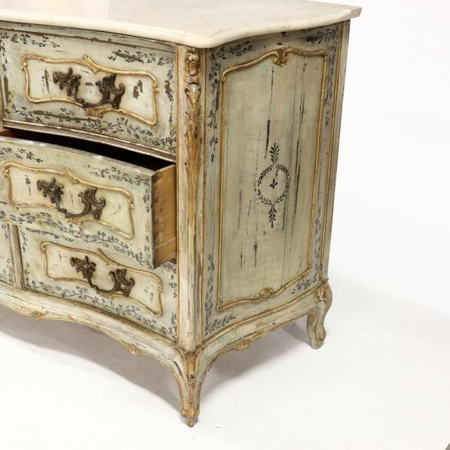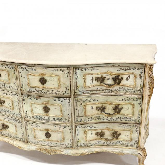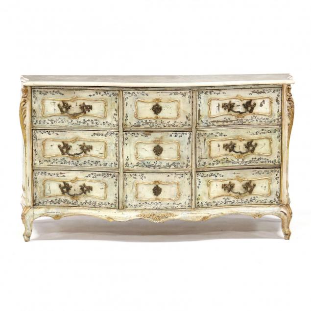 20th century, serpentine front, shaped molded marble top, central three stacked drawers flanked by three concave stacked drawers, paneled sides, allover cream field with hand-painted floral highlight, corners with relief carved acanthus leaf with mustard paint, the whole raised on whorl feet.