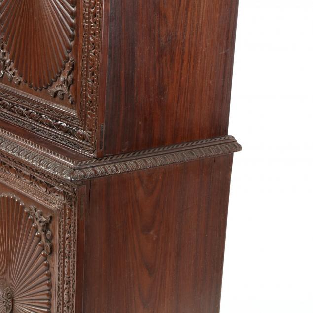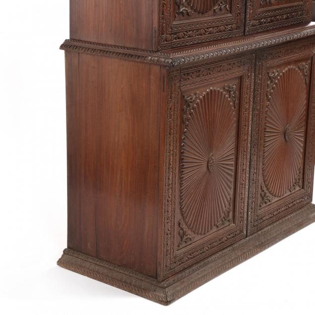 Mid-19th century, mahogany, two-part form, upper case with applied cornice above a vine and berry relief carved frieze, above four robustly relief carved stylized sunburst paneled doors, the upper case with two shelves, the upper and lower case each with two shelves, applied molded and carved flush base.