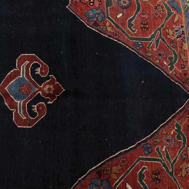 Circa 1880, wool, navy blue field with large diamond shaped poled medallion, red spandrels which continue down side of rug; red main guard border, rosette and serrated leaf with reciprocal trefoil design.