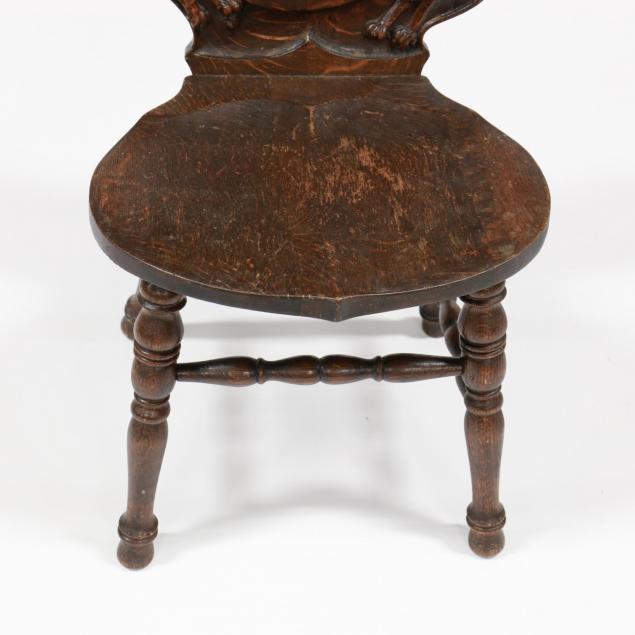 Late 19th century, scalloped panel back relief carved with cat and dog, saddle seat, turned splayed legs with stretcher, partial label to underside and inscribed "Made by Jungwirth Studio Detroit."
