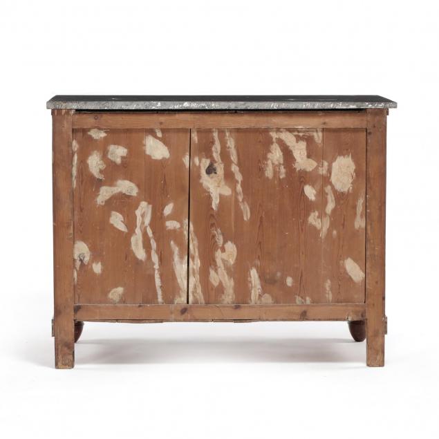 From the Collection of a Gentleman, Florida Wear and scraping to marble top; some chipping to marble edges; left and right side panels with full height shrinkage cracks; light veneer buckling to drawer fronts; middle case drawer with repair and coloring to left drawer side; some veneer chips and losses to horizontal drawer stiles.