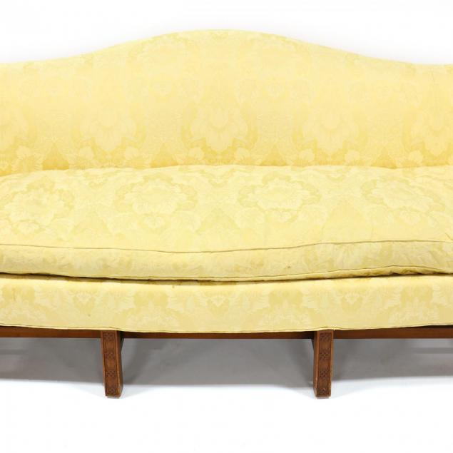 Late 20th century, mahogany, camelback frame with gold damask upholstery, scrolled arms, loose down filled cushion, raised on straight legs, with fretwork, and stretcher base.
