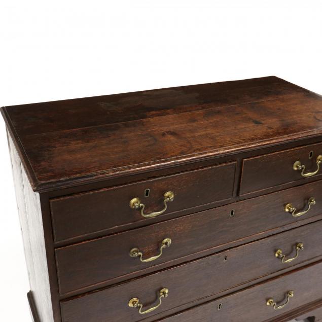 Late 18th century, top with applied molded edge, two over three graduated and cock beaded drawers raised on straight bracket feet.