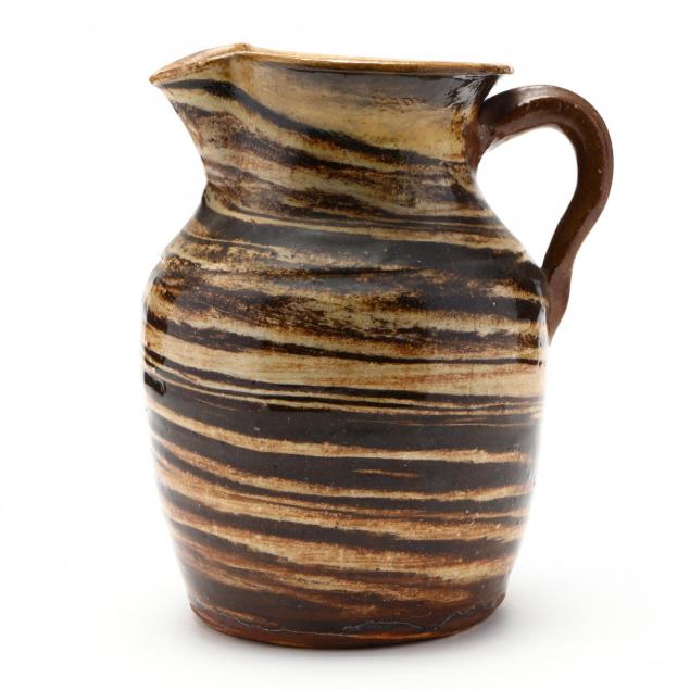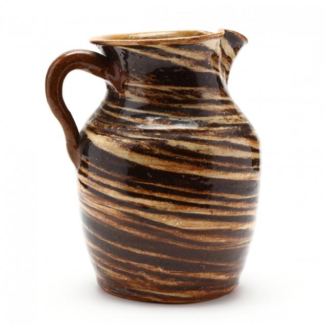 1930s-40s, two color clay swirl, extruded handle, incised line at the shoulder.