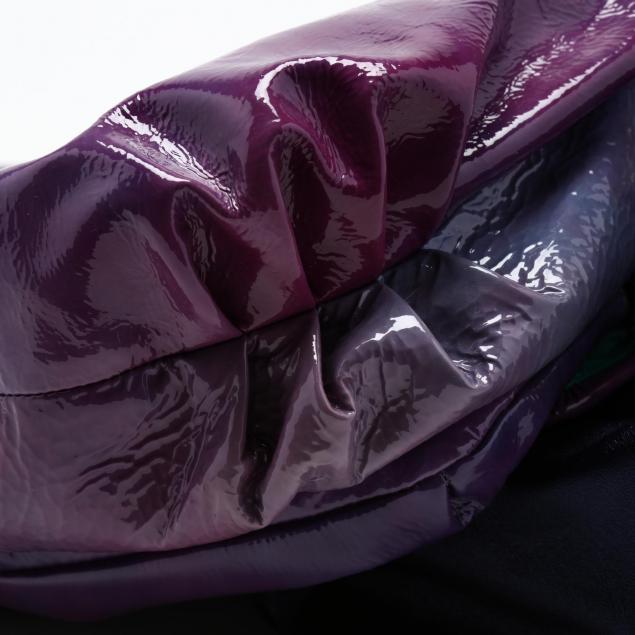To include a large tote style Coach Poppy patent leather shoulder bag in an luminescent purple, with removable crossbody strap and silver tone hardware, turquoise colored fabric lined interior; together with a large tote style Coach Poppy leather shoulder bag in a deep midnight blue with metallic glow, gold tone hardware, cream colored fabric lined interior; also with a black patent leather wristlet.