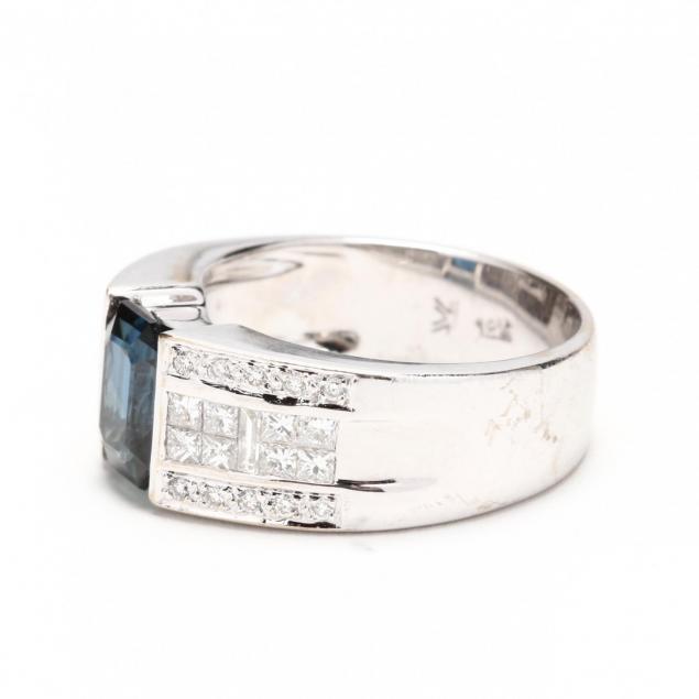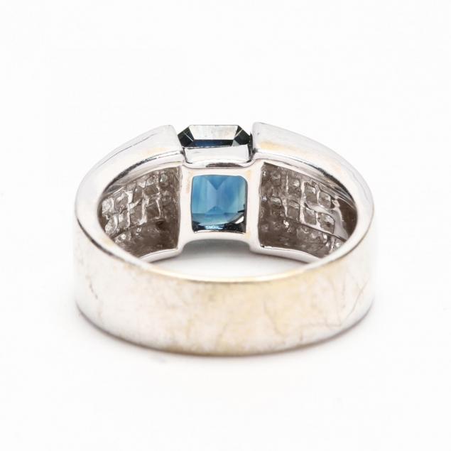 Centering on an emerald cut sapphire (8.0 x 6.0 x 4.42mm) weighing approximately 2.12 carats accented to each side of the wide shank with sixteen princess cut diamonds, (20) round brilliant cut diamonds and two baguette cut diamonds with a combined approximate weight of .78 total carat ( H-I color, SI clarity), stamped 18KT and signed LeVian.
