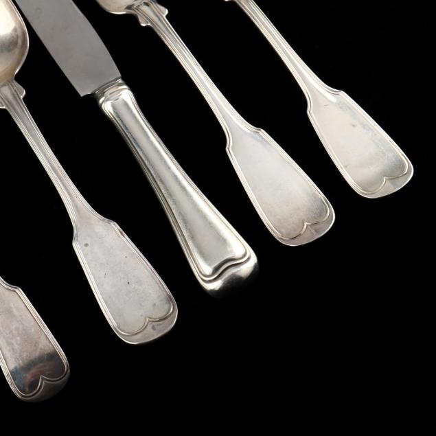 (45) pieces, mostly in the fiddle and thread style, including: (8) knives; (5) tablespoons; (12) oval soup spoons (approximately 6.75 in.); (4) egg spoons; (2) teaspoons; (10) forks (approximately 7.75 in.); (3) forks (approximately 7.5 in.); and a butter knife with pseudo English hallmarks. Various monograms and makers including Bailey & Kitchen. The knives are not marked.