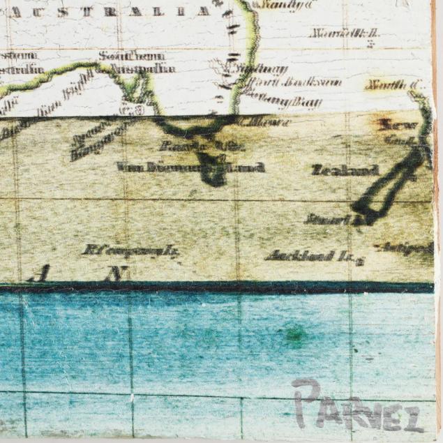 Paint and printed map on wooden, dated 2013, ink signed "Parvez" at lower right, retains artist's information to verso with additional signature.