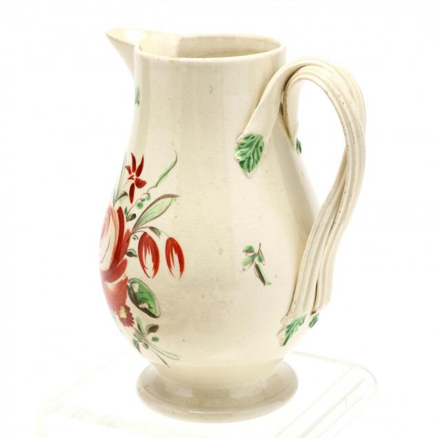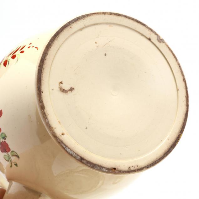 Late 18th or early 19th century, cream field with floral painted decorations, to include a teapot with high dome lid, a tea caddy, three small tea pots, a creamer, a sweetmeat basket, and three plates, all unmarked, one cylindrical teapot retains a label from Mr. & Mrs. Jerome Blum, proprietors of Willow Corners Antiques, Lisbon, Connecticut.