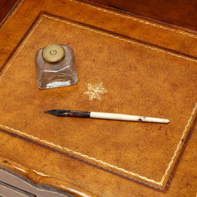 20th century desk, flat writing surface encompassed in a shaped backsplat over two pull out drawers, raised on four feet, gilt and tooled decoration; 19th century or early 20th century accessories to include four inkwells, sealing wax, and a calligraphy pen.