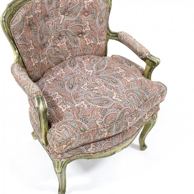 Mid 20th century, caned back, attached tufted cushion, serpentine seat with loose down filled cushion, relief carved frame with distressed green painted surface.