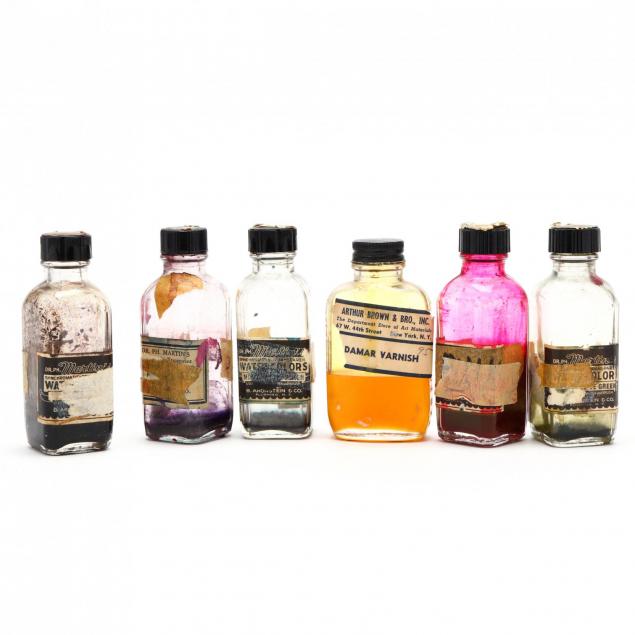 The collection includes a sample sheet of various watercolors with Halpern's handwritten notes presented under glass in a bird's eye maple frame and six glass bottles of various watercolors and varnish.