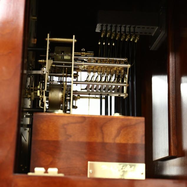 Late 20th century, made in USA, model 233, one-part form, mahogany with light and dark wood inlays, broken arch pediment with removable urn finials, hinged beveled glass door, with silverplate and gilt face, with subsidiary seconds' dial and moon dial, beveled glass waist door, with beveled glass sides, flanked by fluted columns, on a flush molded base, with pendulum and three weights, numbered 162 of 1000.