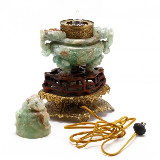 Circa 1920-1940, in the form of a censer with dragon handles and domed cover, with brass collar and mounted atop a hardwood and gilt metal base.
