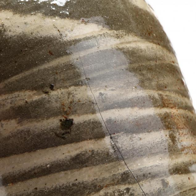 Two swirl ware vases; the first a baluster vase, gray and white glazed clay swirl, stamped on the bottom (11.5 x 6 in.; the second a four handled porch vase of light tan and white glazed swirl, sine waves decorate the band between the handles, stamped on the bottom (17 x 11 in.) (firing cracks to the handles; drying crack on the bottom; .5 inch chip to the underside of the exterior rim); the third a buggy jug composed of gray and white swirl clay, large applied features, open mouth with five china plate teeth, glazed inset blue eyes, inscribed on the bottom "B.B.CRAIG / HENRY N.C."(12.75 x 7 in.)
