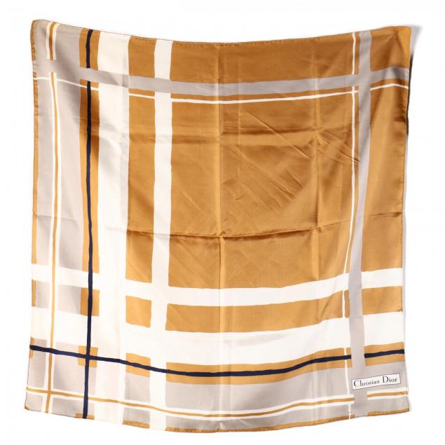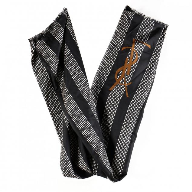 The first, a YSL stole, black and white with an armhole at either end (68 x 34 in.); a silk blend fringed brown checked scarf, also YSL (26 x 32 in.) (some stains); the third, a Christian Dior block print scarf (28 x 30 in.); the fourth, an Hermès