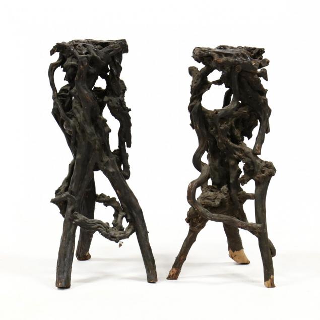 Early to mid 20th century, hardwood, twisted wood organically forming these stands, an austere scholarly decoration.