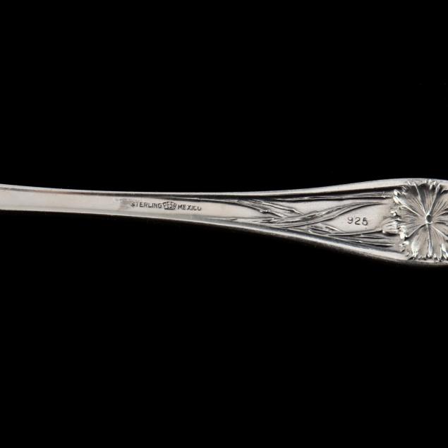Including a set of six International "Mille Fleurs" orange spoons with tea rose motif, no monogram (5 7/8 in.); and a sterling silver serving spoon marked "Sterling Pesa Mexico 925," no monogram (8.75 in.).
