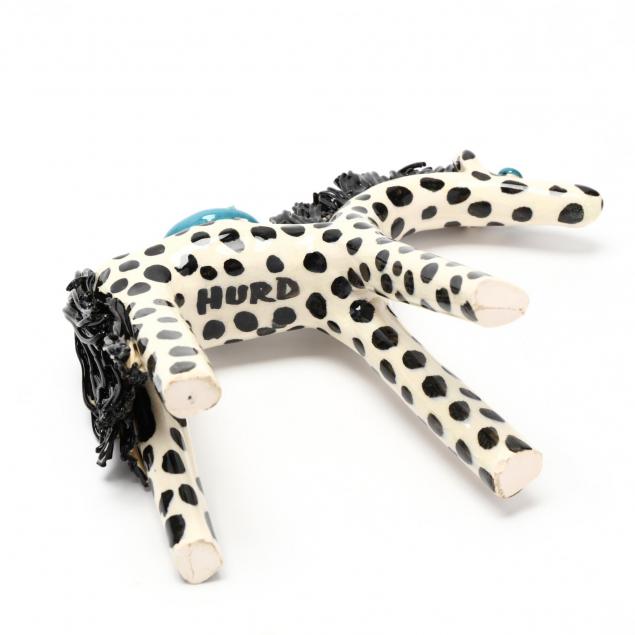 Late 20th century, hand formed and painted with polka dot decoration with saddle form candle cups and signed "Hurd" to undersides.