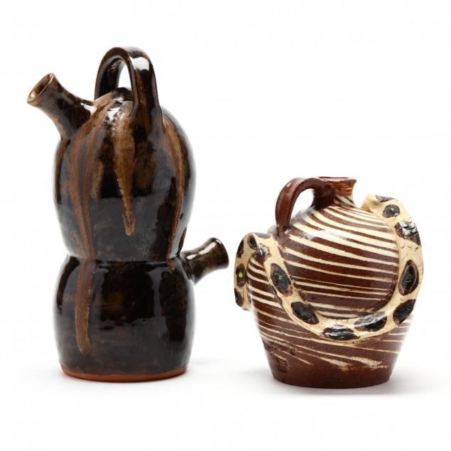 The first, an earthenware snake jug, Albert Hodge, swirl glazed, artist stamp on the bottom (7.25 x 5.5 in.); the second, an earthenware monkey jug, Walter Fleming, double chambered, each with a spout, with single strap handle, dark brown glaze with decorative runs, signature inscribed in script on the bottom (11.5 x 6 in.)