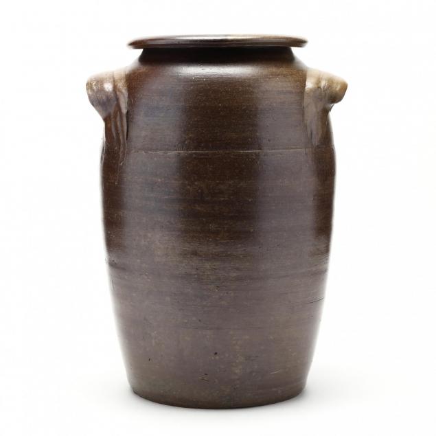 Salt glazed, with a slightly rolled rim, wide applied ear handles, potter's stamp under one handle as well as the coggle wheel capacity mark, additionally stamped with a small starburst shape known to have been used by Craven,