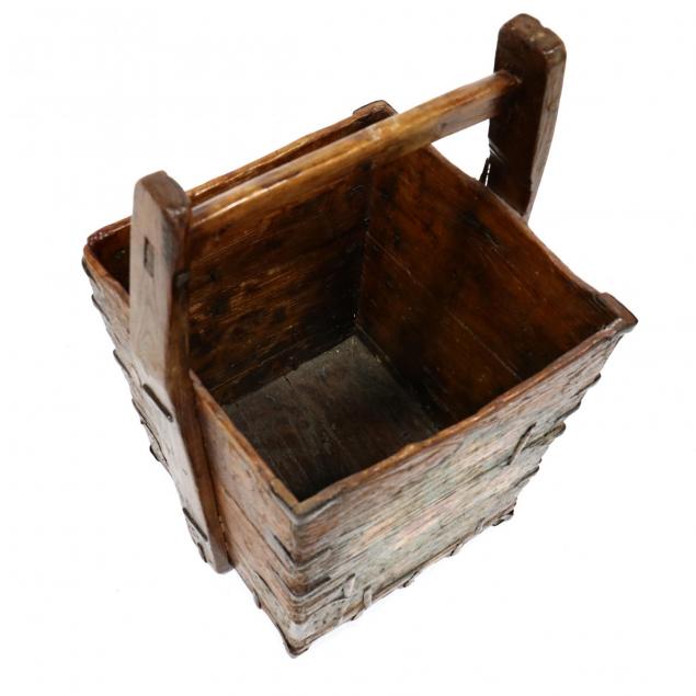 19th century, handled form with iron mounts and remnants of floral paint decoration.