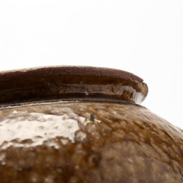 19th century, alkaline glazed stoneware, the first has approximately three gallon capacity (12.75 x 10 in.) (2 in. hairline from rim; rim chipping; one handle with small chip the other with large chip; base with long hairline); the second jar approximately one gallon (rim chip; some slight glaze flaking) both unmarked.