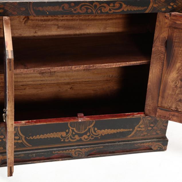 20th century, rectangular form in black paint with two doors featuring floral and antique decoration in gold against a red ground.