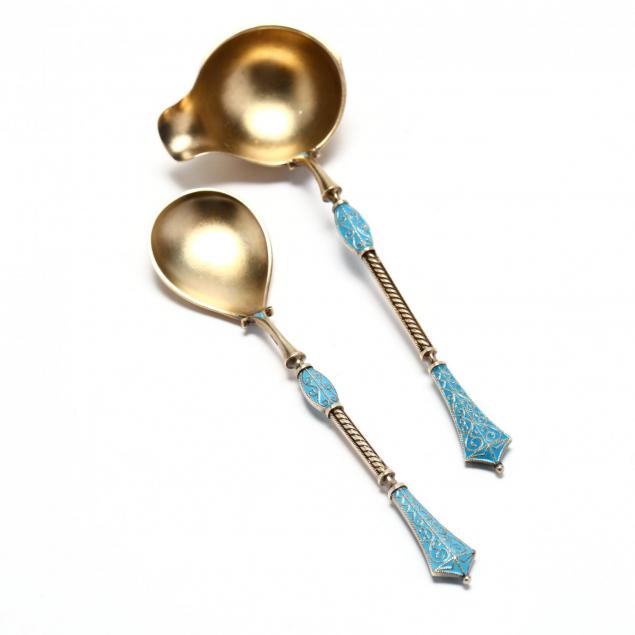 Two Enameled Silver Gilt Servers