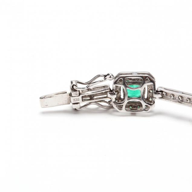Bracelet with nine oval cut emeralds weighing approximately 2.81 total carats and with medium light to medium color prong set in rectangular pavé diamond halo links, connected with pavé set diamond bar links, completed with a tongue and groove clasp with a figure eight safety clasp. Approximate total diamond weight 2.16 carats with G-H color and VS-SI clarity.