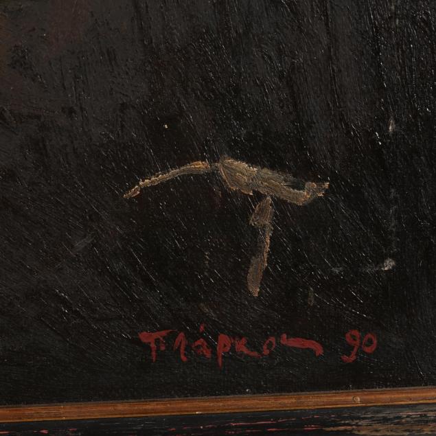 Oil on canvas, artist-signed lower right. Presented in painted wooden frame.