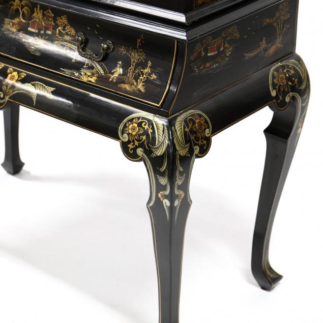 Late 20th century, three-part form, broken arch pediment with shell carved finial, hinged glazed doors with mirrored and shelved interior, concave drawer, drop skirt, on cabriole legs, the whole with black lacquer and painted decoration of figures in a courtyard.
