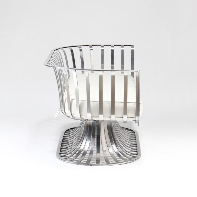 1960s, shaped slat form, with later white leather upholstered seat cushion, unmarked.