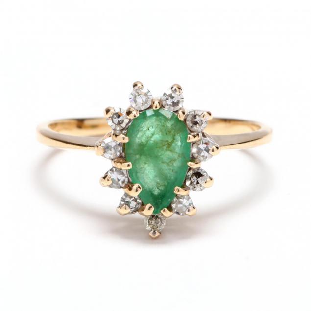 Featuring a pear shape emerald weighing approximately .49 carats, surrounded by eleven prong set single cut diamonds weighing approximately .22 total carat ( J-K color, SI-I clarity), stamped 14KT.