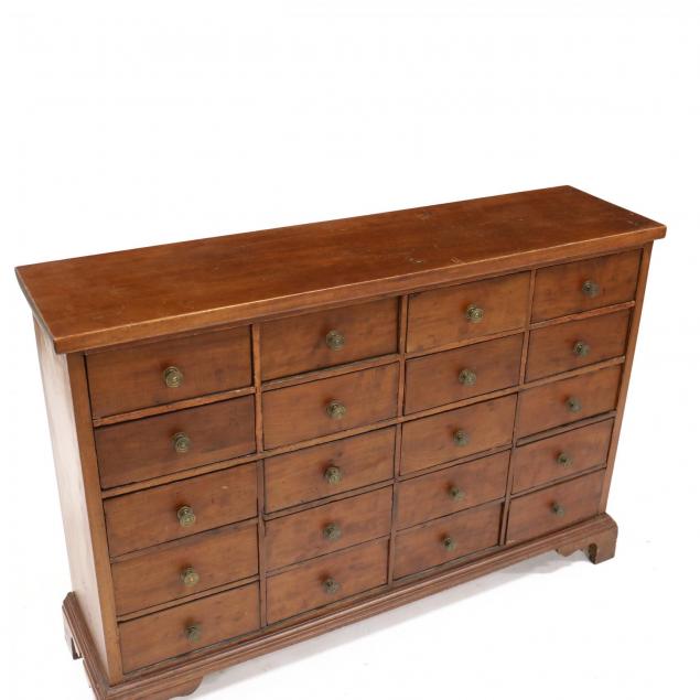 Cherry and mixed woods, white pine secondary, (20) 19th century drawers set in a later custom case with bracket base.