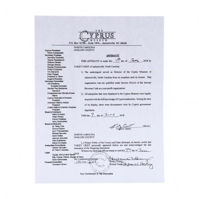 notarized affidavit signed by the museum's director. It declares that all of the museum's antiquities were acquired legally with the full knowledge of the Cypriot Government and that there were documented visits to the museum by Cypriot dignitaries.